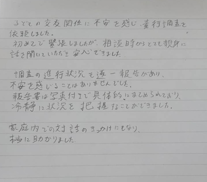 浮気調査を中心に、家族の家出、ストーカー被害、従業員の不正疑惑等、たくさんの深いお悩みに真摯に向き合い、解決に導いてきた確かな実績がございます。