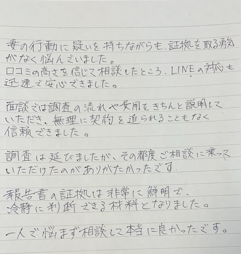 居住地近隣エリアで、不貞調査をお願いできる探偵事務所をネット検索した際に、Googleの口コミ評価も高かったため、LINEで連絡をさせていただきました。