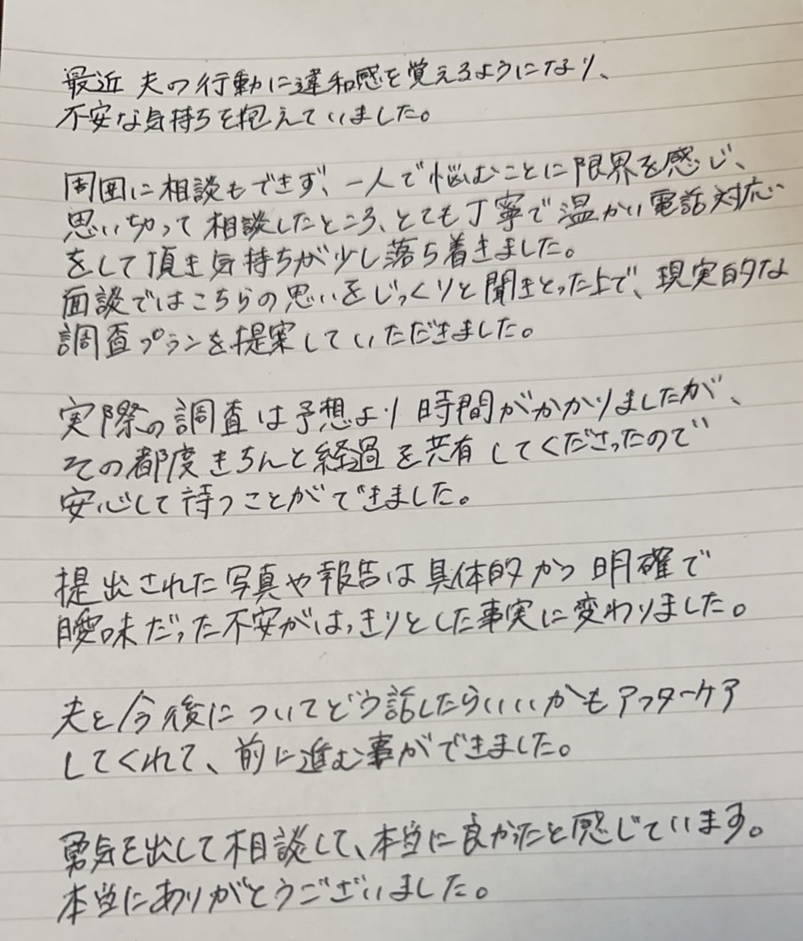 夫の浮気調査をお願いしました。自分の今後の将来に12万円は安いと思って、とにかく自分を納得する証拠が欲しかった。誰にも相談できなかったところに、とても親身になって何時間でも相談に乗って頂きました。